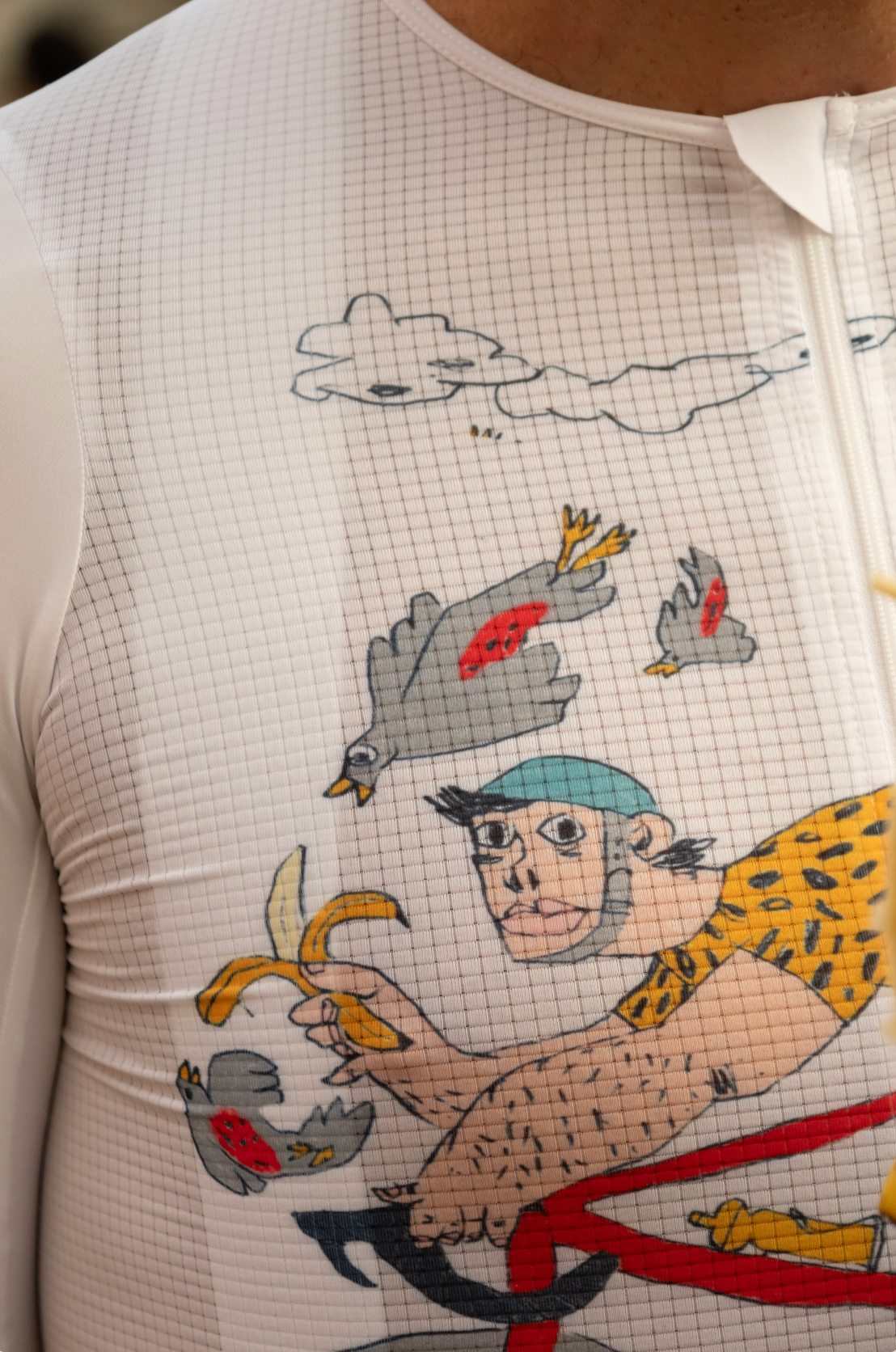 The jersey design is the result of Roberta's free interpretation, who, with her uniquely personal graphic style, wanted to depict a humorous scene: a cyclist about to eat a banana before the next climb, supported by his loyal dog bringing him a hot, steaming espresso—forget energy bars!